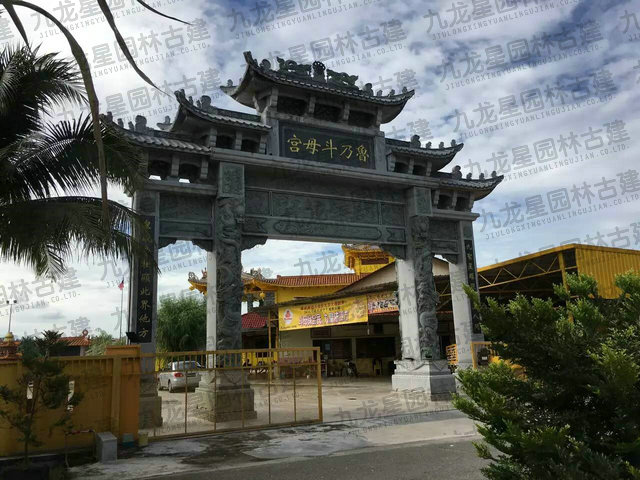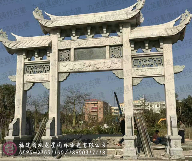 牌坊集中了中國古建筑最有特征的構(gòu)件組成,有臺座、柱身(包括夾桿石)、梁坊、樓匾、斗拱、樓頂?shù)葮?gòu)件。石造牌坊材質(zhì)堅固敦實牢靠,且可仿照木結(jié)構(gòu)造型。在藝術(shù)處理上,可以在夾桿石、柱子、額坊等處,雕刻各式各樣的花鳥、圖案、龍鳳及各種瑞獸等等,將中國傳統(tǒng)的石刻藝術(shù)集中于一身表現(xiàn)出來。中國民俗專家講:“石雕不開光是石雕工藝品,開光后就是具有靈氣的風(fēng)水神器。”所以“非寧靜無以致遠,非精誠無以神明。” 石牌坊是用石修建的牌坊,是一種裝飾建筑物。柱石的上方刻有麒麟、獅子,夾柱石的浮雕有雙獅戲彩珠,牌坊上還雕刻著其他怪獸云紋。兩側(cè)基石柱各有撐鼓,石柱兩側(cè)配有石獅。牌坊運用浮雕、透雕等手法,是我國建筑藝術(shù)的一大特色。