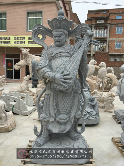 石雕東方持國(guó)天王.名多羅托,身著白色,穿甲胄,手持琵琶琴。用琵琶彈奏,使之缽依佛門,以音樂感化眾生護(hù)持國(guó)土。其職責(zé)是:保護(hù)東方國(guó)土,保護(hù)眾生,保護(hù)東方弗提婆洲人民。