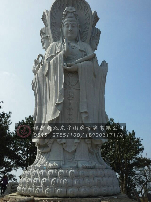 石雕三面觀音,字面意思就是一個(gè)觀音像有三個(gè)面,一般是正面的觀音手持經(jīng)篋,相鄰的右邊的觀音持蓮花,在其左面的觀音手持念珠,這三個(gè)面的觀音,手持經(jīng)篋的觀音象征這智慧,手持蓮花的觀音象征著平安,手持念珠的觀音則象征著仁慈。每一個(gè)觀音像都蘊(yùn)含著大智慧。正面的觀音體現(xiàn)著觀音的般若德即智慧德性,意思就是徹底擺脫無明煩惱和種種束縛,并且達(dá)到大自由、無束縛、大自由的境界。石雕三面觀音的整體概括智慧、慈悲、和平的精神象征。