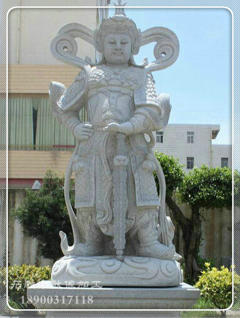 在中國的寺院殿宇里原印度血統的韋馱已經被漢化,成了一名地道的中國武將,他身披鎧甲,手持金剛杵,降魔去妖,威風凜凜英俊威武。天王殿中所塑的韋馱形象,一般具有兩種站立的姿態:一個是雙手合十,降魔杵橫于腕上,直挺而立;一個是一手握杵拄地,另一手叉腰。前者雙手合十,表示此地是十方叢林,歡迎來客,遠游的行腳僧可安心住下。后者則示本寺不接待來僧掛單,行腳僧最好另投山門。