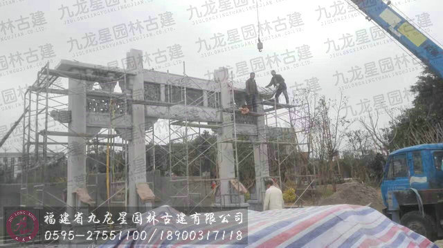 石雕牌樓材質用料:石鼓、柱座石材G654#;窗花、花托、石拱青石;主體結構石材G606#