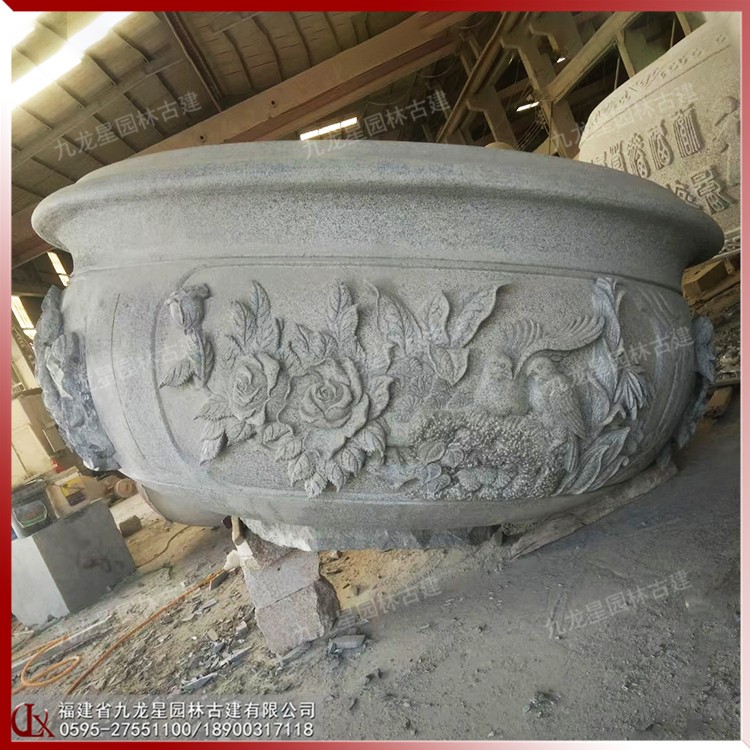 石雕做成的中式石材花缽古樸大方,古香古色,非常適合中式建筑的搭配展示,特別是這種具有現代特色的經典傳承文化的創新之作,更是讓人感到耳目一新,并且庭院中擺放這樣的精致雕刻的花缽,在一定程度上提升了整個建筑的檔次。