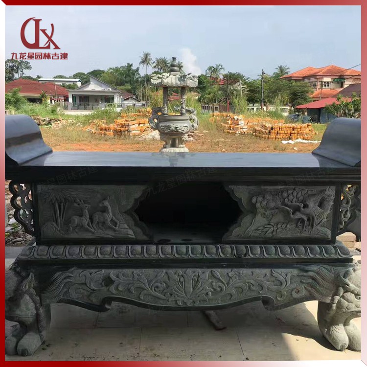 這款供桌全身采用青石加工而成,供桌前后各雕刻浮雕圖案雙龍戲珠、松鶴鹿竹等古代吉祥圖案。雙龍戲珠寓意著人們對美好生活的追求。另一面雕刻長壽仙獸鹿鶴,寓意福壽延年,高官厚祿。在色彩方面,因為選用青石的原因,讓整個石雕供桌充滿了古香古色的意境,供桌雕刻紋理清晰精致,是一款上檔次且大氣樸實的石雕供桌作品。